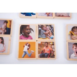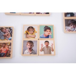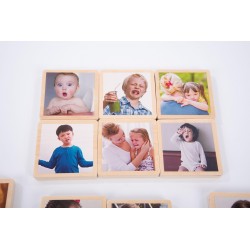 Ces images montrent différents enfants affichant une gamme de 18 expressions et réactions, allant de la joie et de l'excitation à la peur et à la colère. Les émotions présentées peuvent être identifiées comme un sentiment spécifique ou comme point de départ d'une conversation sur les différentes émotions ou sentiments possibles ressentis. Par exemple, l'enfant qui tient une peluche en train d'être réconforté a l'air triste, ce qui peut être dû au fait qu'il se sent seul ou timide.