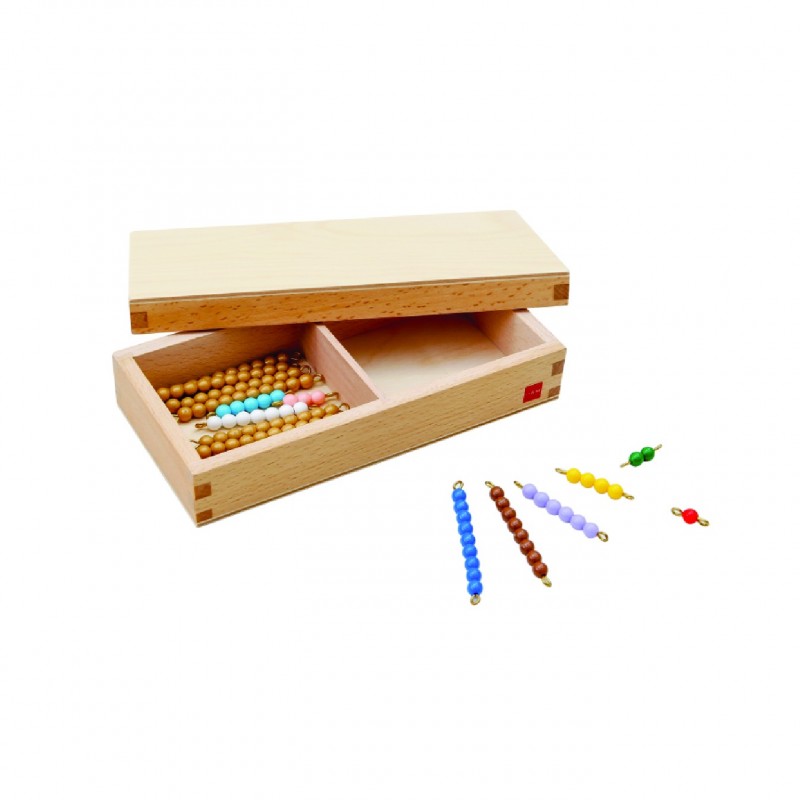 Boîte avec deux compartiments contenant des barres de perles colorées de 1 à 9 et neuf barres de perles dorées de 10, à utiliser avec les planches pour adolescents.