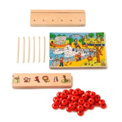 Le coffret contient 3 cartes en bois avec 6 thèmes, 6 cartes d’instruction en bois, 40 perles en plastique rouges, 6 bâtons en plastique et un support en bois.